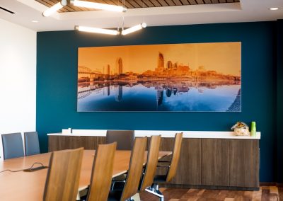 The Company Accolade Wall is adjacent to the executive offices on the second floor. It tastefully displays the company’s mission statement and values and successes over the years. Like the other walls, everything we did was with custom casework and wood finishes built with custom LED lighting to enrich the look.