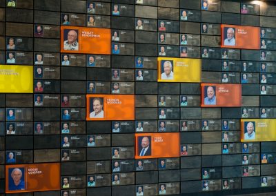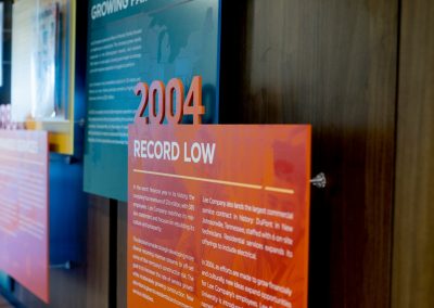 Above the Tenure Wall on the second floor is the Company History Wall. It features floating shelves with actual artifacts, such as letters, pins and patches from yesteryears. It has LED lighting and multiple panels custom painted to match the color palette of the building to it flows harmoniously with the rest of the building.