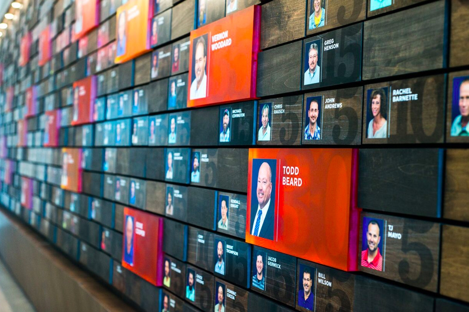 On the first floor is the Tenure Wall. Employees who have been with the company for five or more years earn their spot on the display. It’s super simple for Lee Company to update and adjust over time, but it also looks like art and has a very elegant and permanent look.
