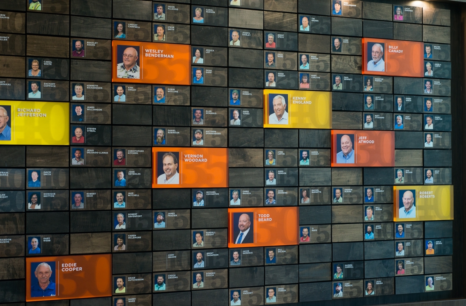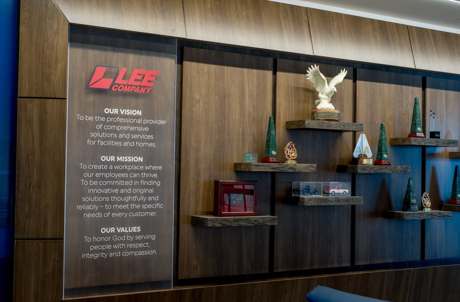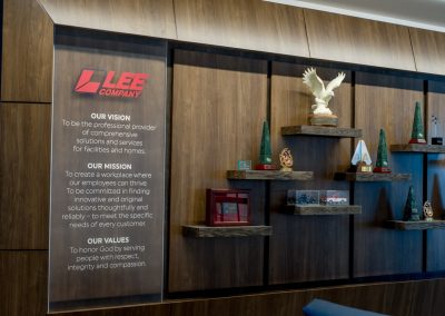 We designed Lee Company’s new office to revolve around three prominent walls. We refer to these walls as the Tenure Wall, Company Accolade Wall, and Company History Wall.