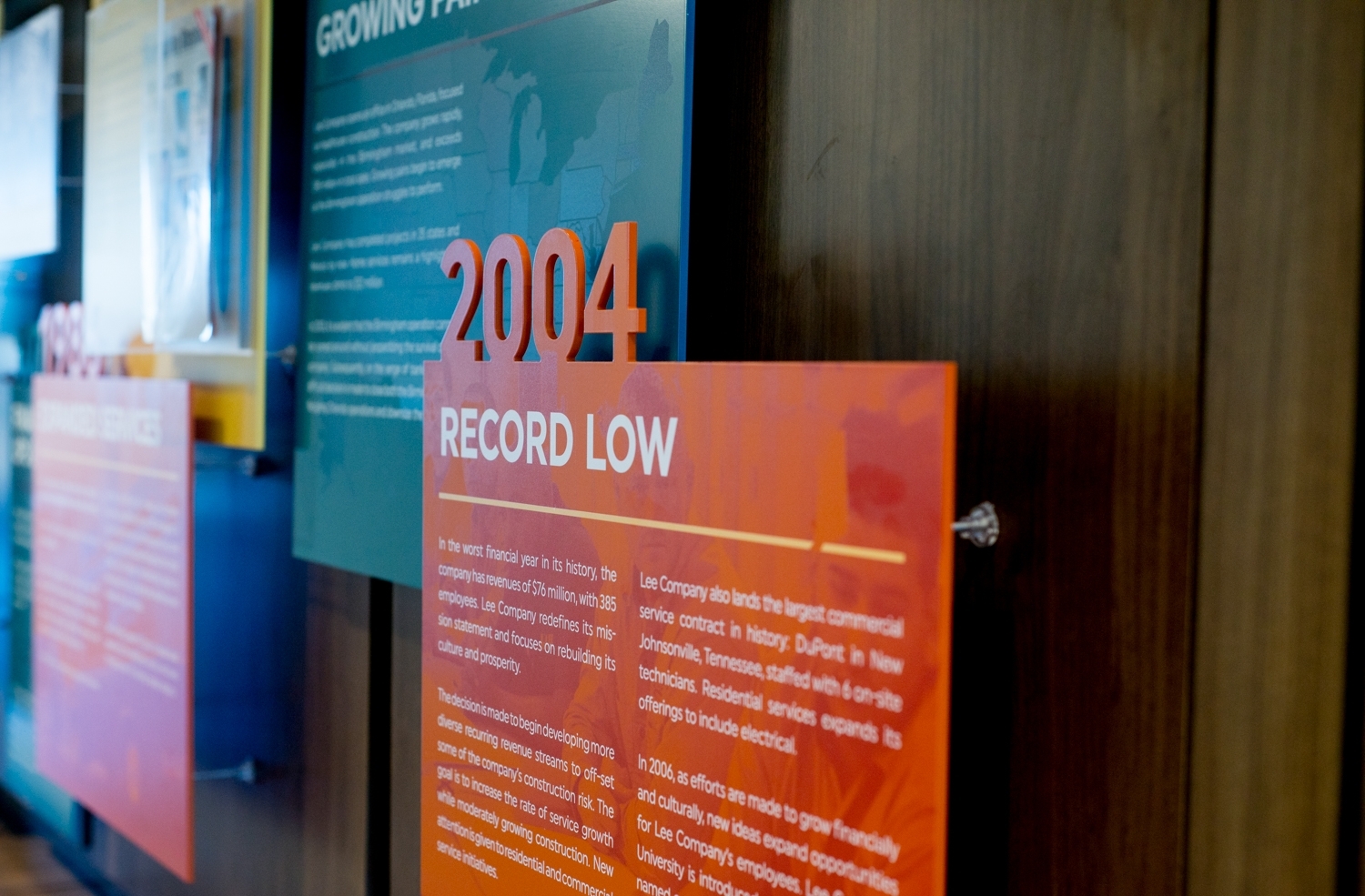 Lee Company is a $225 million mechanical contracting, facilities, and home services company with over 1,200 employees. As they moved their headquarters from Cool Springs to Berry Farms in Franklin, Tenn., they needed help presenting their brand identity through architectural signage and environmental design in their new space.