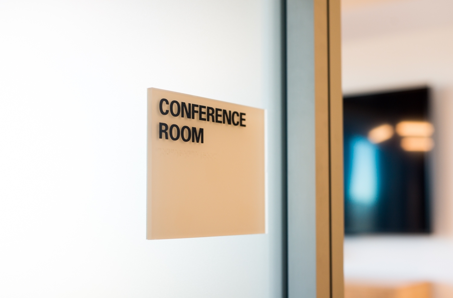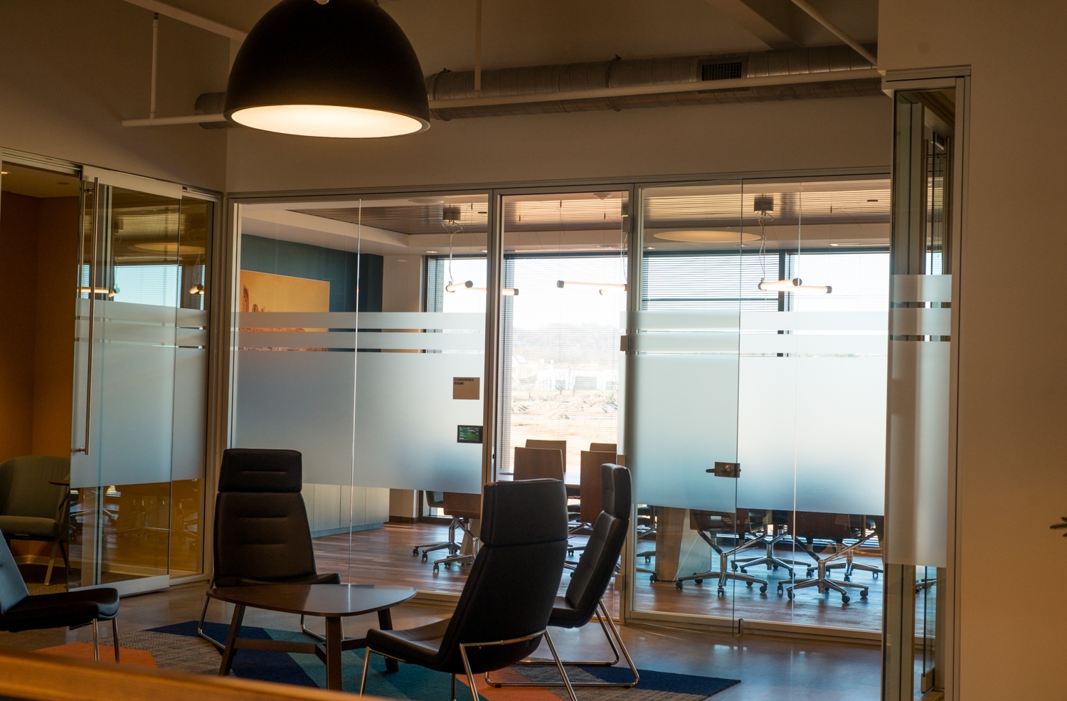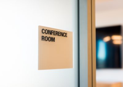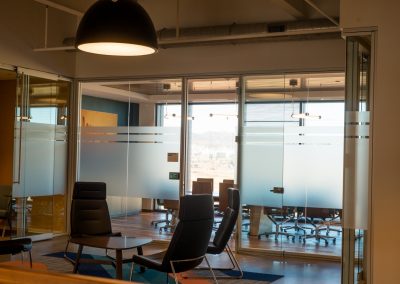 With these walls anchoring the overall look of the space, we worked on a custom wayfinding package to fit well into the design. There is no generic ADA signage in the building. We also installed etched vinyl on basically every office window which is about a four-foot stripe that floats in the middle of the glass to provide privacy. Finally, we visited their fabrication shop to take our photos to be used in the silicon edge graphics. These are tight, abstract pictures such as HVAC coils, ductwork, and things we felt like we could make very graphic and artistic.