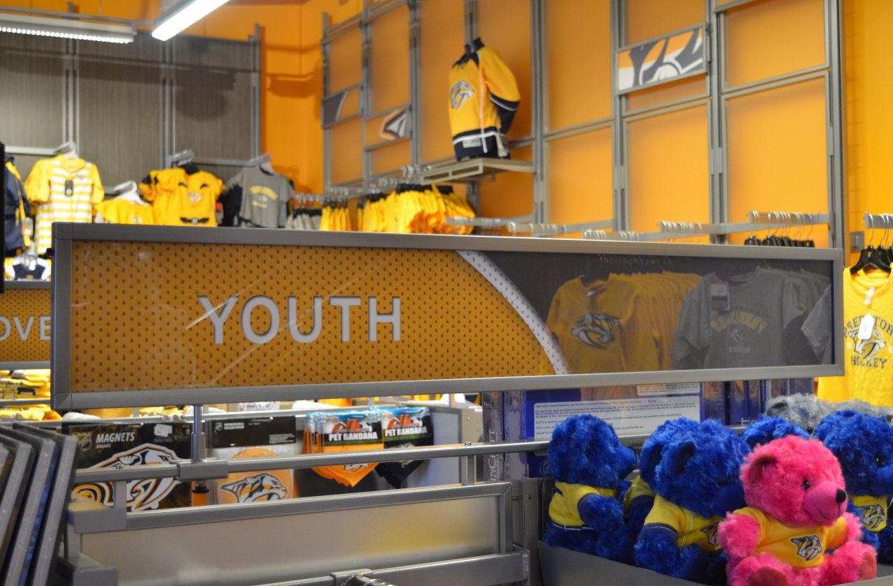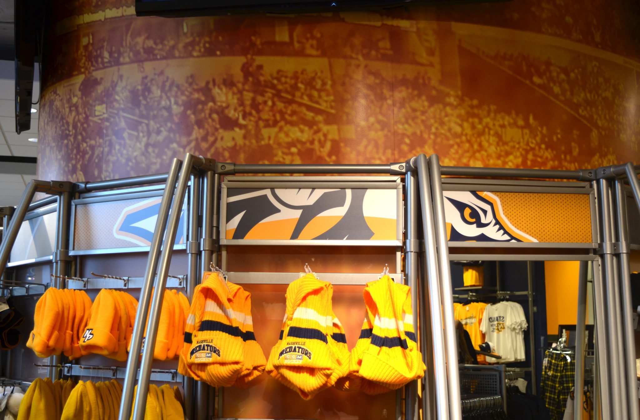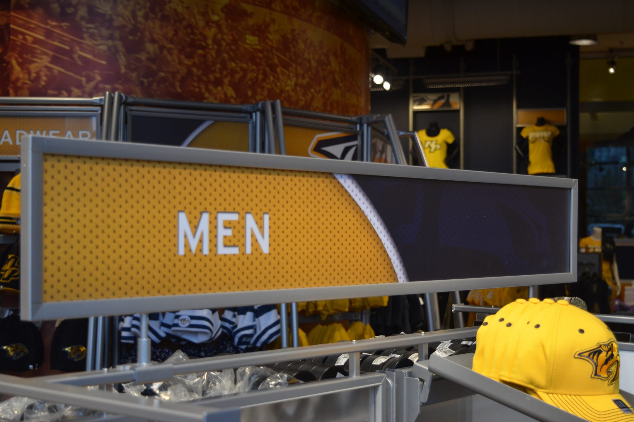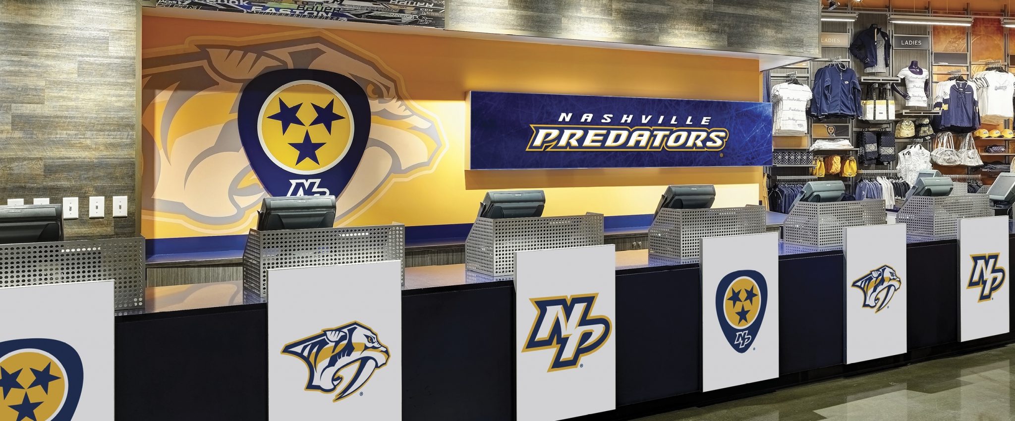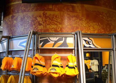 Once inside the Nashville Predators Team Store, we wanted it be an easy sell for all of the products. We ensured this by using eye-catching signage that is strategically placed throughout the store. For instance, we created a digital wrap for the giant point-of-purchase display in the middle of the store. We also created header inserts to make it easy to navigate and find desired items. For the cash register, we produced a visually inviting environment full of digital prints featuring memorable Nashville Predators logos. Every Big Visual Group product was intentionally created to increase revenue for the Nashville Predators and help shoppers easily navigate the store.