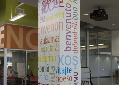 We helped them figure out the needs that their visitors would have while visiting the library. This meant figuring out the right balance between keeping a peaceful, inviting library environment, while keeping library guests properly informed with items like ADA compliant signage. We also understood the desire to keep the library environment unique to its specific area of town. Antioch is a very diverse community, with the residents speaking a variety of languages. Therefore, “wordles” were created, which feature all types of languages and were used on various types of signage. Zoning in on the special characteristics of each client and their surroundings is crucial to creating a one-of-a-kind environment.