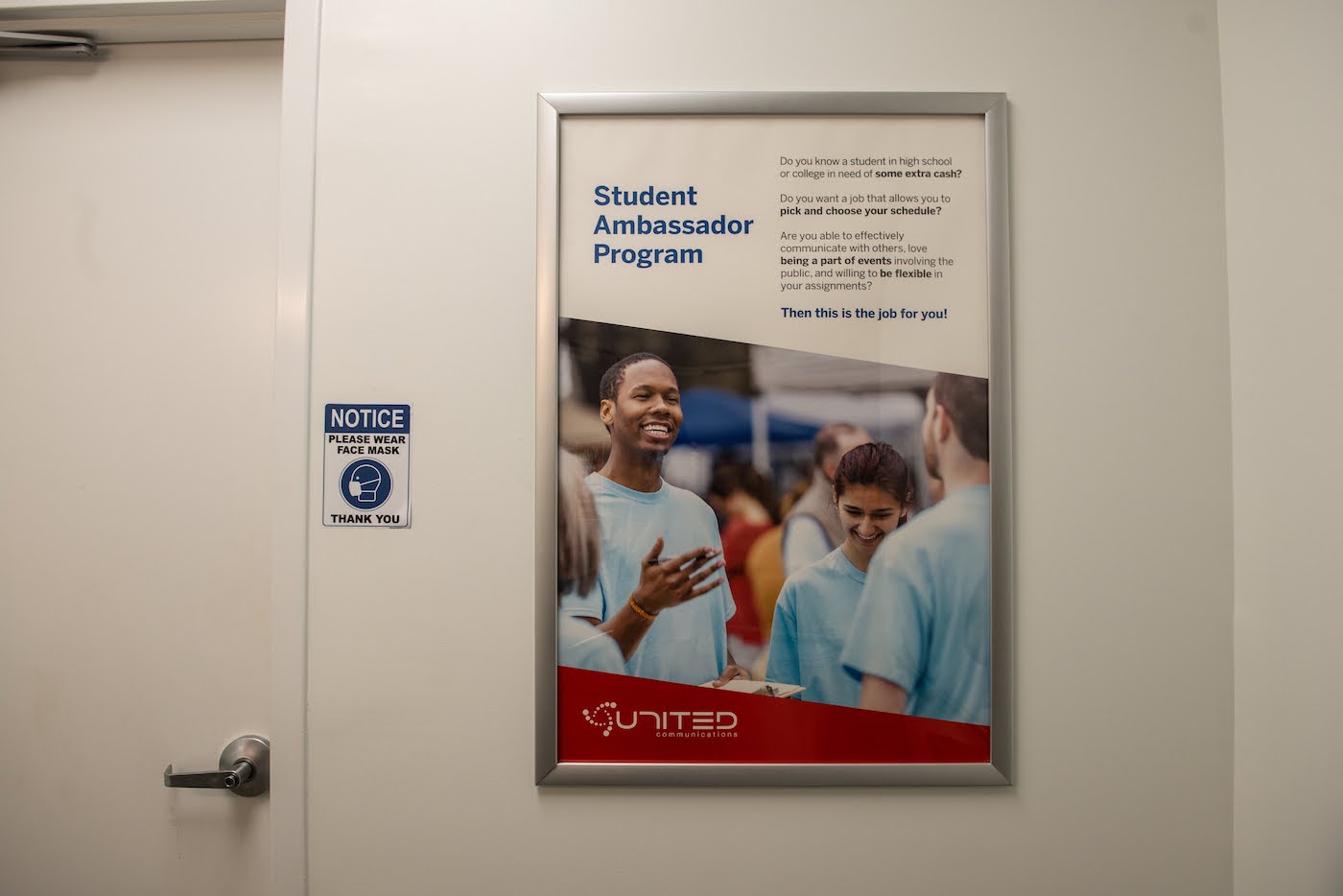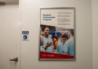 To meet our client’s expectations and execute our vision, we decided to phase out the redesign by updating the interior first then head to the exterior signage. From ADA signs to framed posters to a custom blind for the drive-through window, we have now successfully updated the interior with United Communications’ latest branding. To make our signage stand out, we even advised on new wall paint colors. We look forward to continuing our good progress with the environmental branding on the outside of the building in the near future.